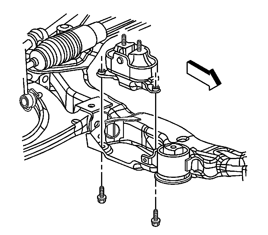 12. Remove the front transmission mount bolt from the frame. Refer to Transmission Front Mount Replacement (4T45-E - Automatic Transmission) for the 4T45-E transmission, or Transmission Front Mount Replacement (Transmission Front Mount Replacement) for the 4T65-E transmission.