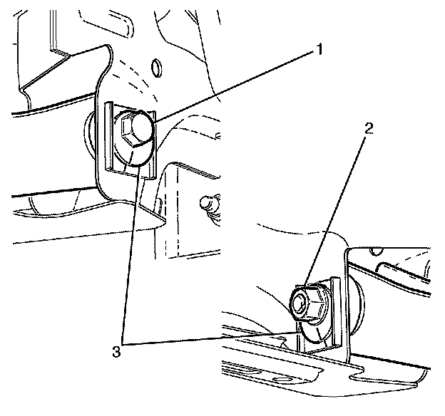 Note:The lower control arm to subframe retaining bolt (1) and nut (2) eccentric washers (3) are used to adjust the rear suspension camber. One eccentric washer (3) is mounted directly to the head of the lower control arm to subframe retaining bolt (1).
