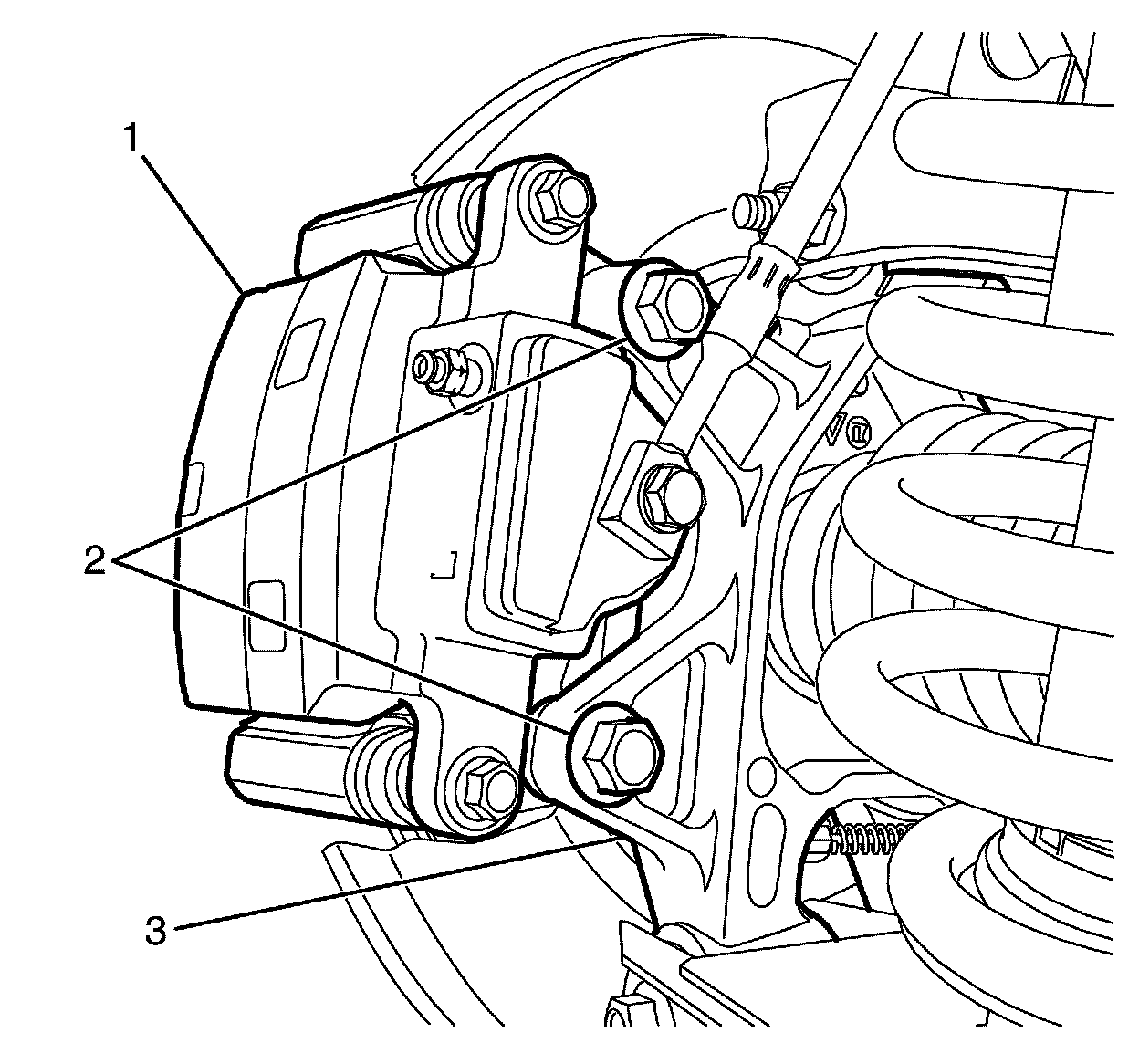 29.Install the brake caliper assembly (2) to the knuckle (3).