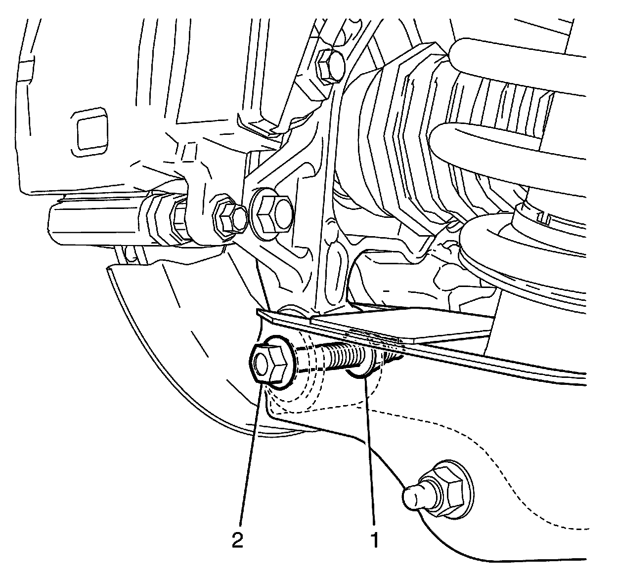 Note:Do not fully tighten the lower control arm to strut assembly retaining bolt (2) and nut (1) at this stage.
