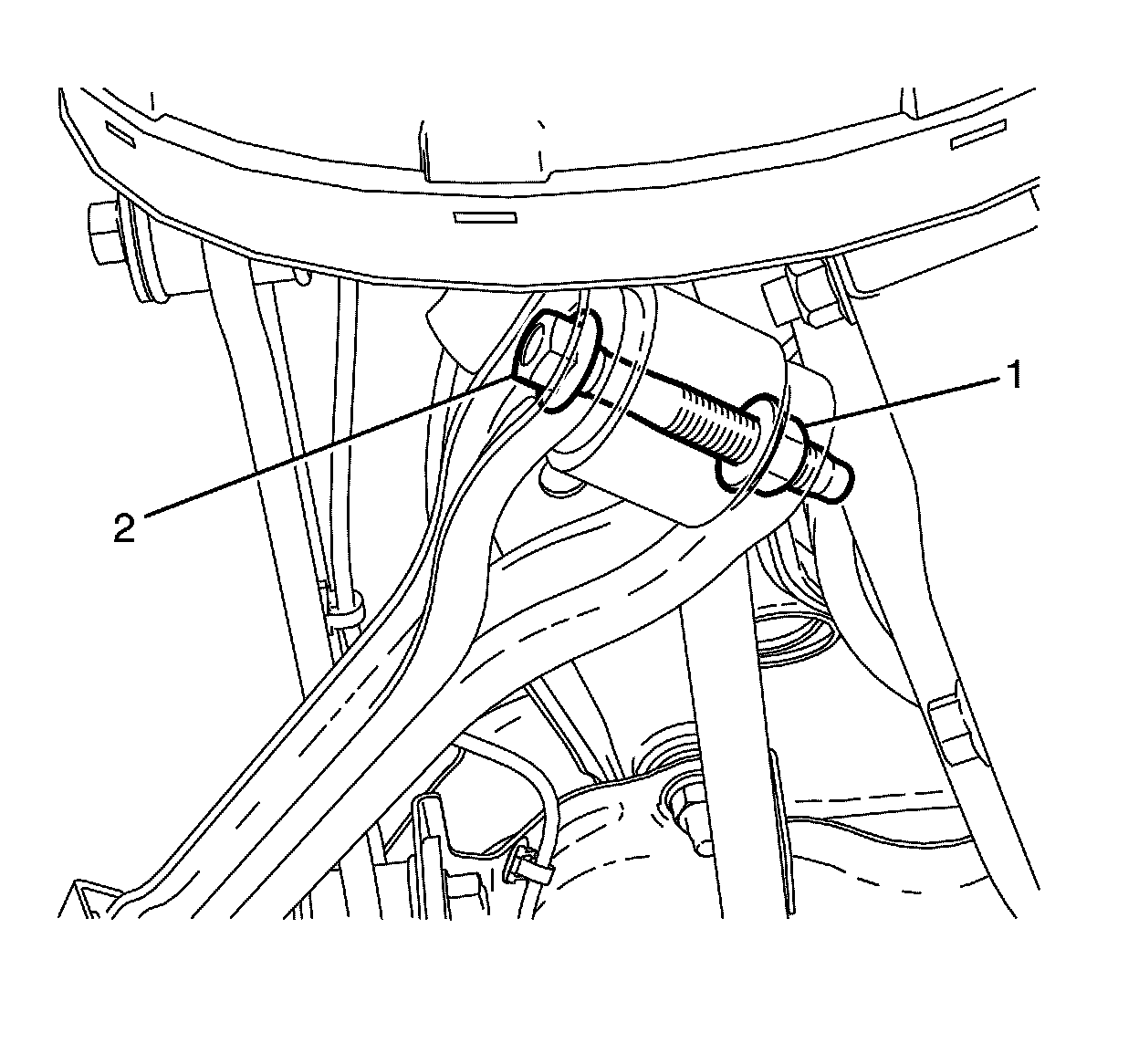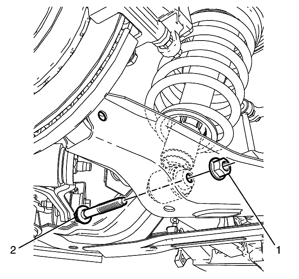 26.Remove the rear strut assembly to lower control arm retaining bolt (2) and nut (1).
