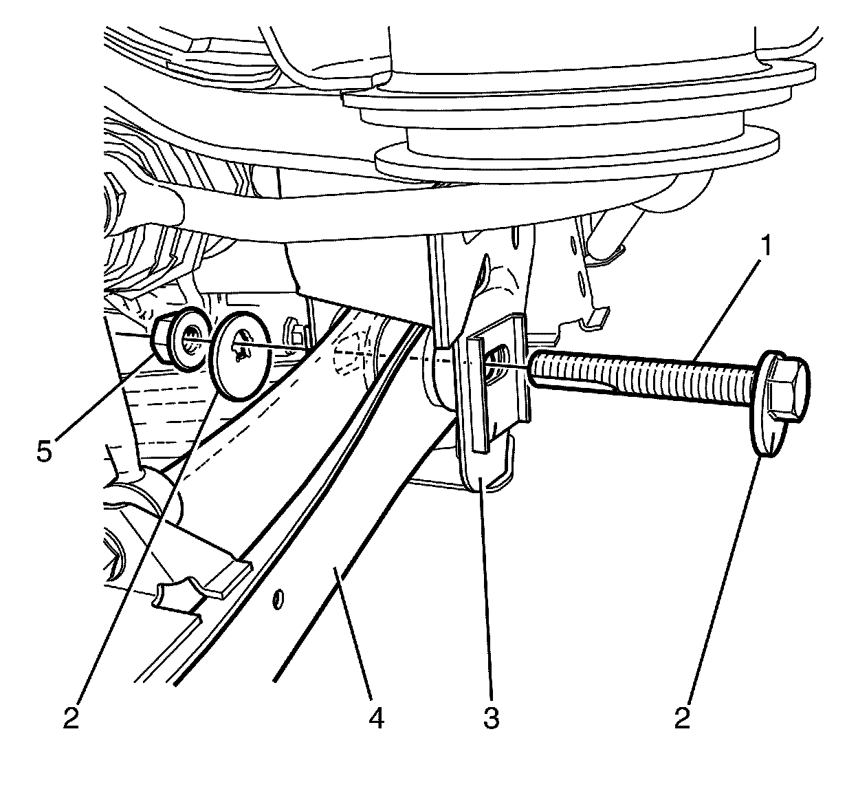 Note:The I-Link to subframe retaining bolt (2), nut (5) and eccentric washers (1) are used to adjust the rear suspension toe. One eccentric washer (1) is mounted directly to the head of the I-Link to subframe retaining bolt (2).
