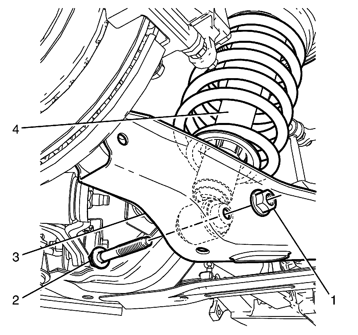 7.Install the Y-Link to rear subframe retaining bolt (3) and NEW nut (4).