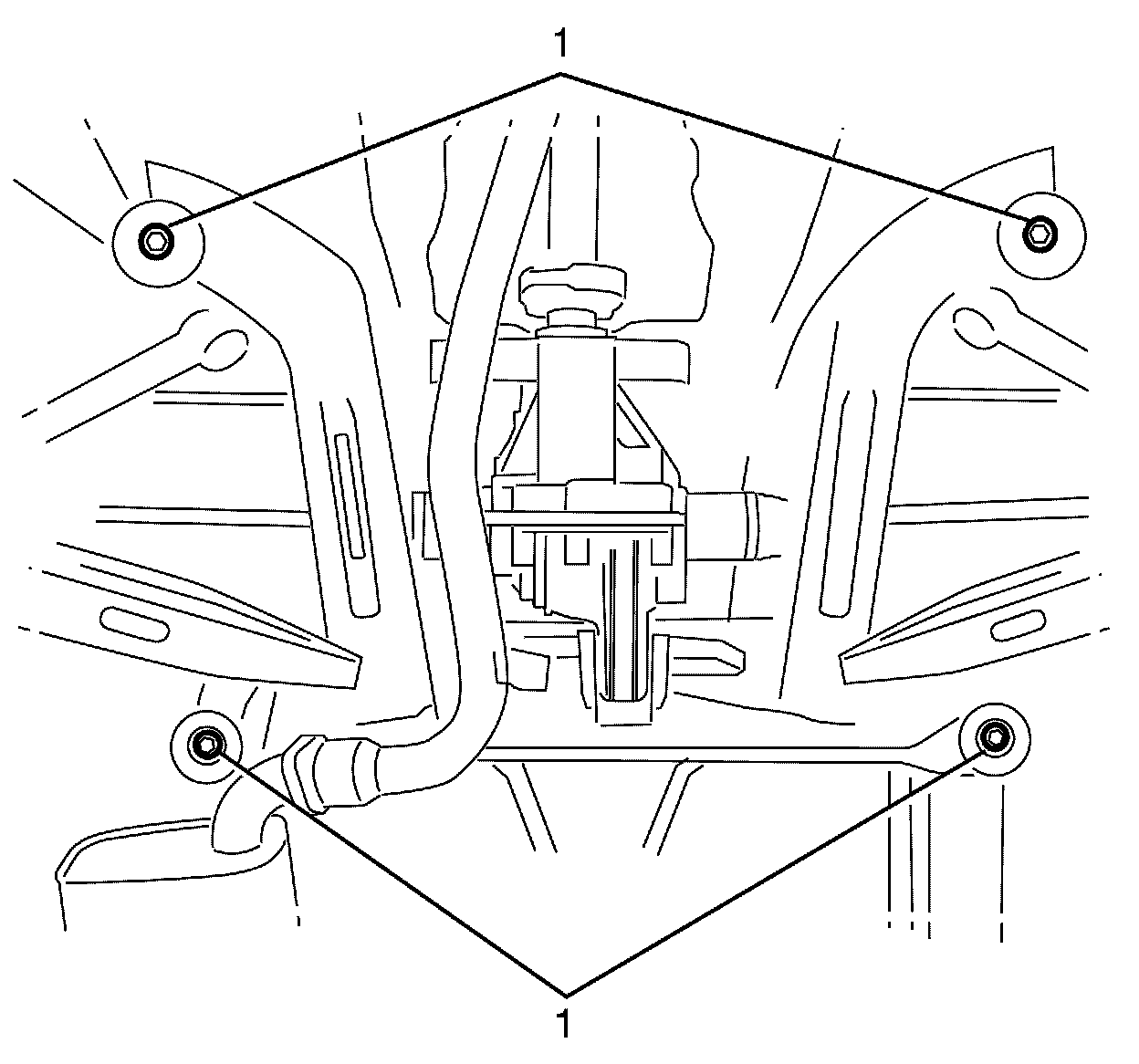 21.Remove the rear sub frame to rear chassis rail retaining bolts (1).