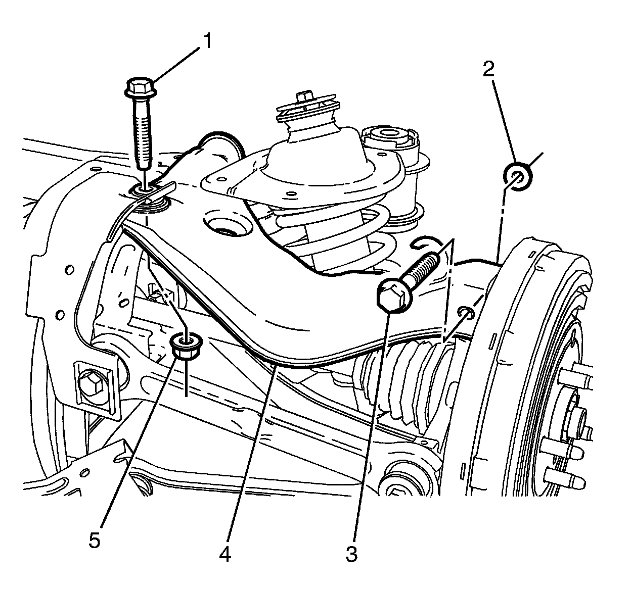 10.Install the upper control arm ball joint bushing to rear subframe retaining bolt (1) and NEW nut (5) and tighten a first pass to80 N �m (59 lb ft) and a final pass 120 degrees.