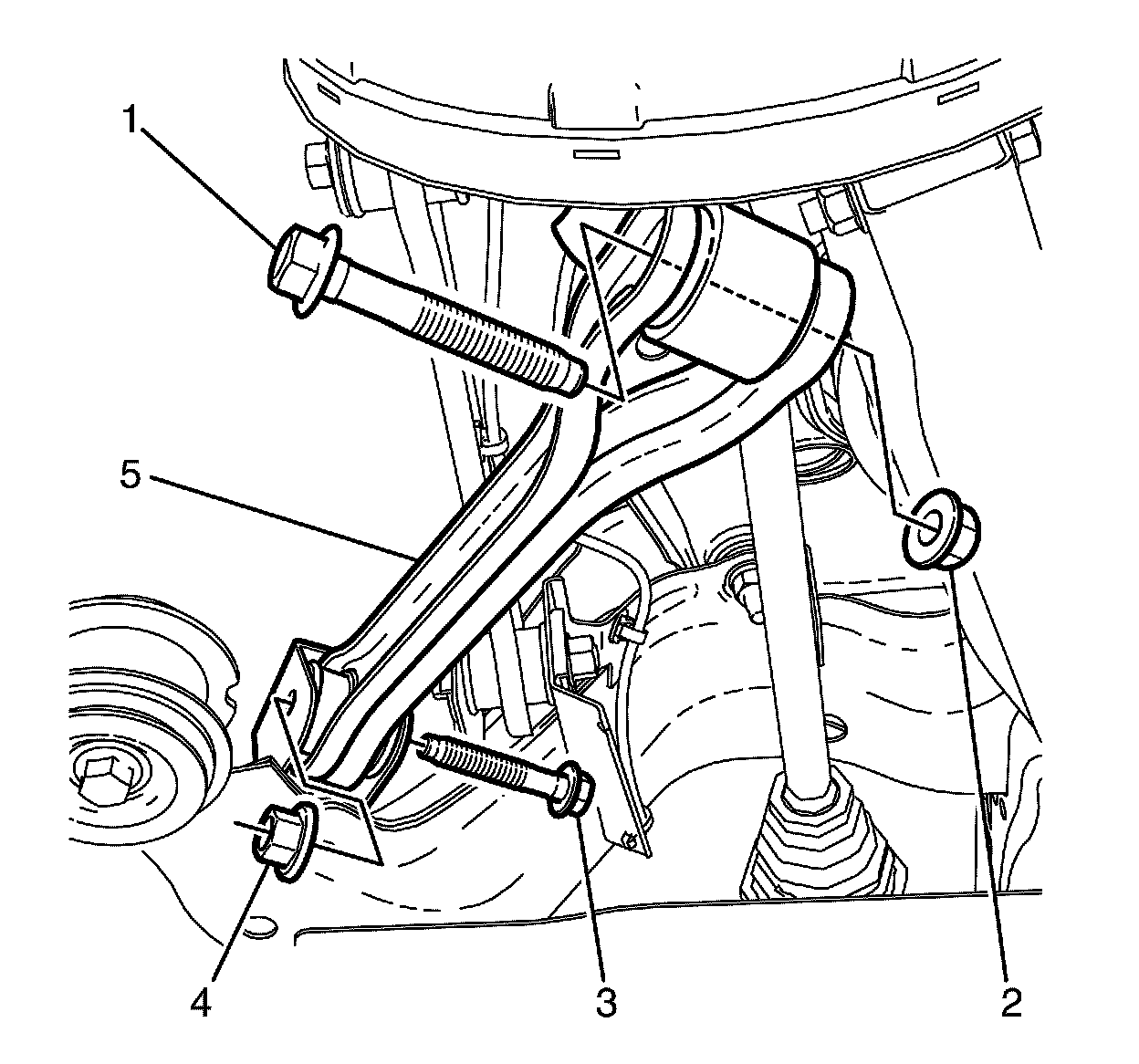 Note:Do not fully tighten the lower control arm to rear subframe retaining bolt (1) and nut (5) at this stage.