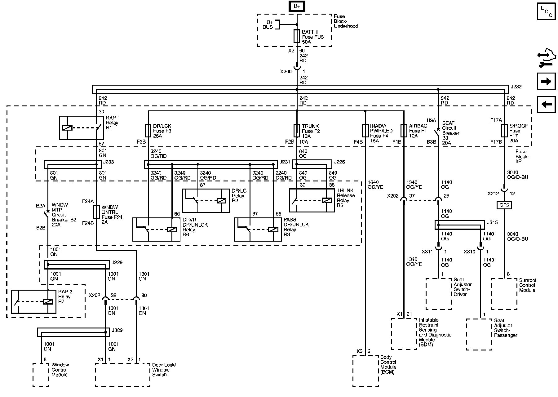 AIRBAG, BATT 1, DR/LCK, INADV/PWR/LED, S/ROOF, TRUNK, WNDW CNTRL Fuses and Seat and WNDW MTR Circuit Breakers