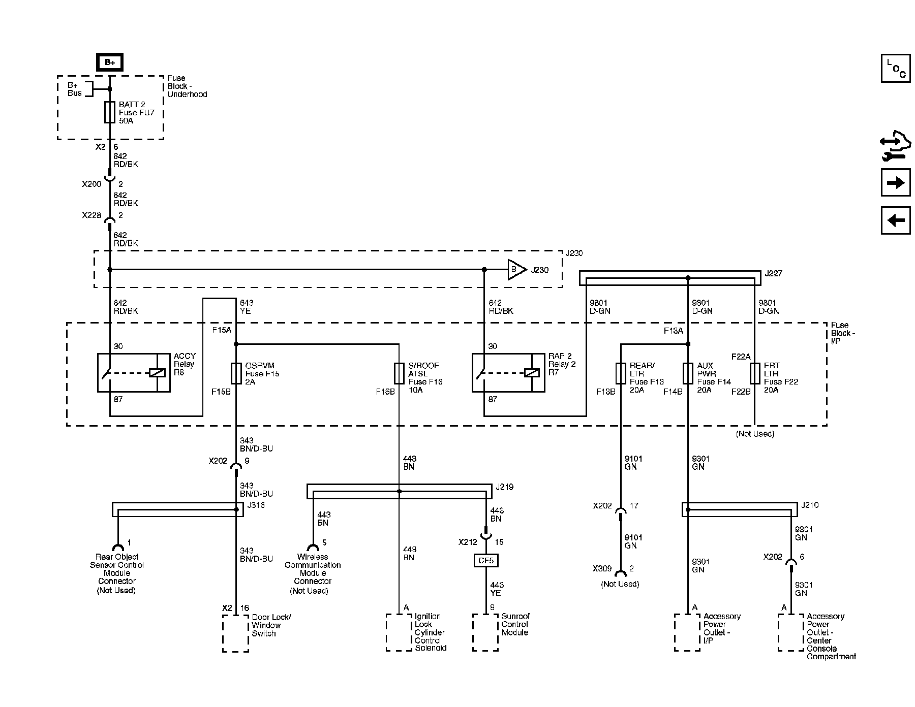 AUX PWR, BATT 2, FRT LTR, OSRVM, REAR LTR, and S/ROOF ATSL Fuses