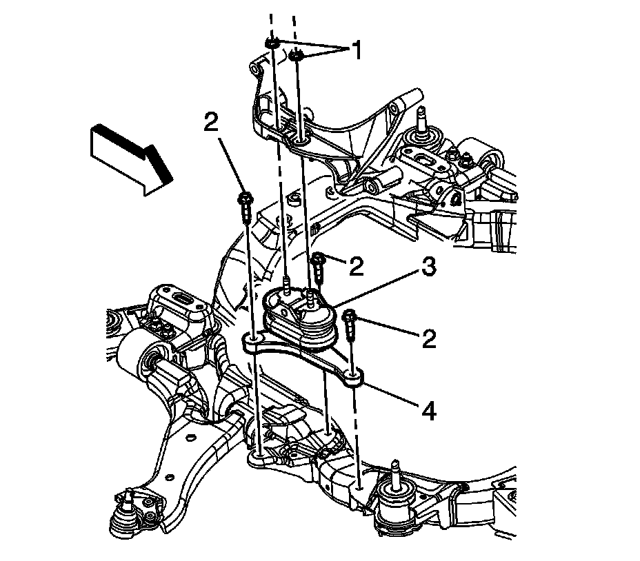 9. Install the front transmission mount thru bolt (1) and tighten to 110 Nm (81 lb ft).
