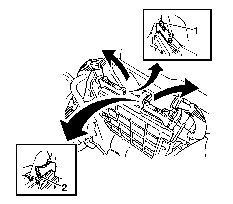 6. Push the locks on the 2 levers (1, 2), then raise the levers, and disconnect the 2 ECM connectors.