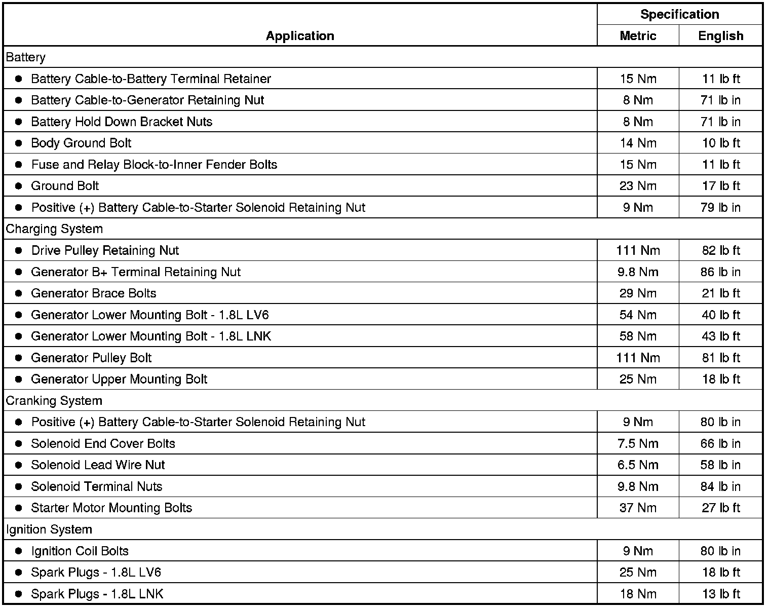Starting and Charging: Specifications
