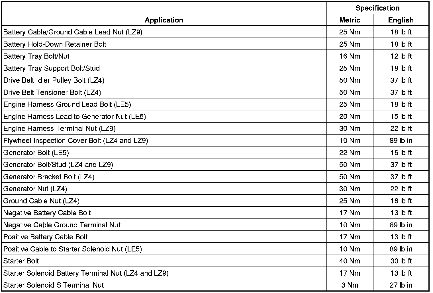 Starting and Charging: Specifications
