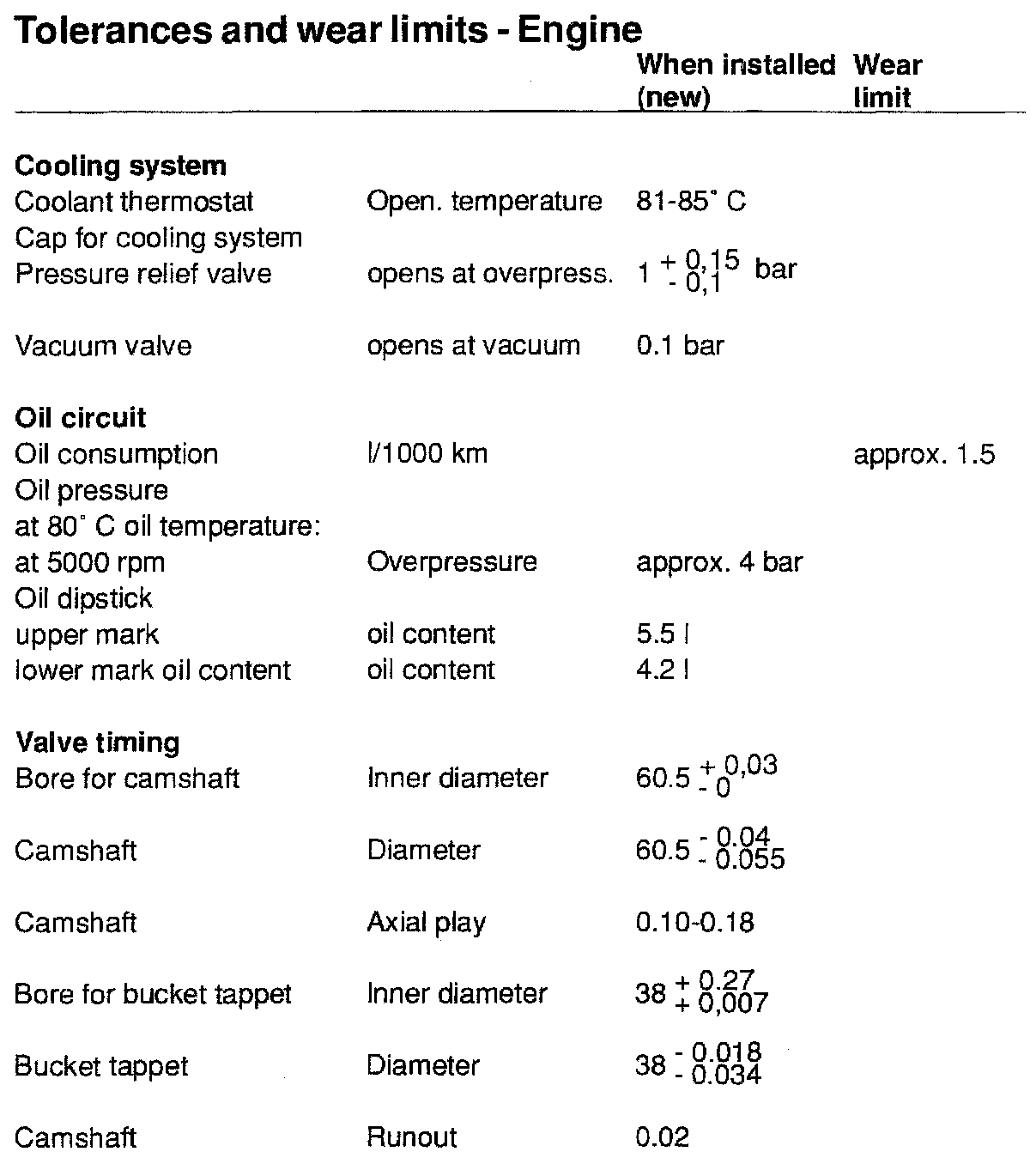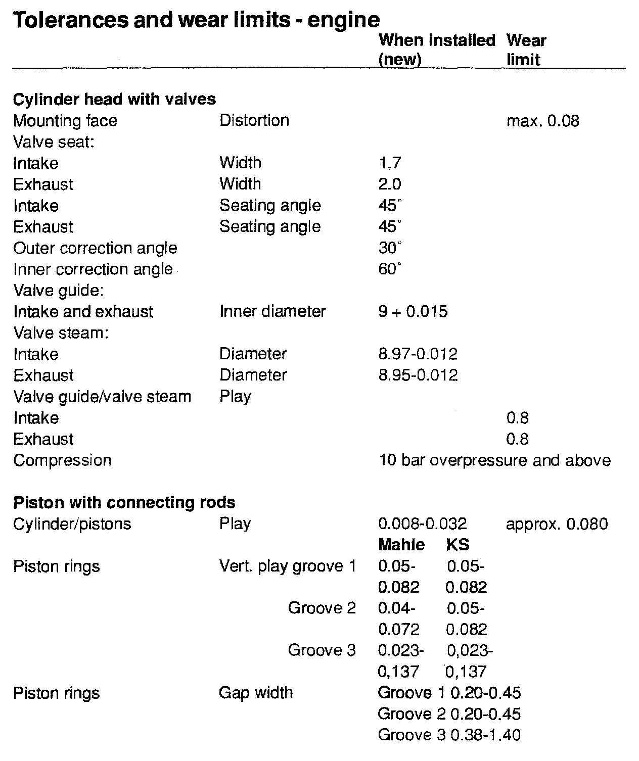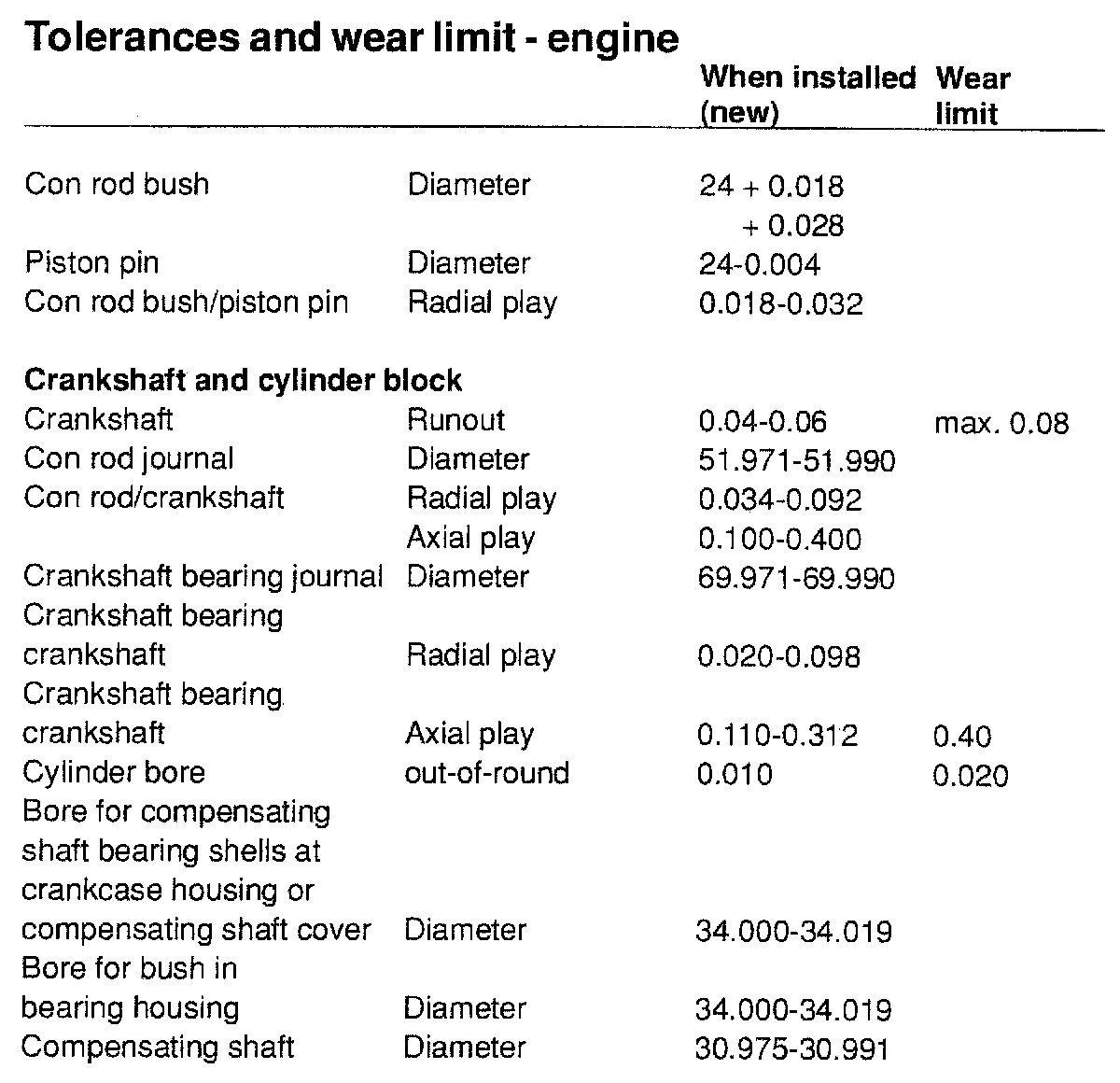 TOLERANCES AND WEAR SPECIFICATIONS