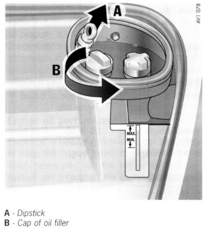 The oil level must in no case fall below the minimum or exceed the maximum oil level on the dipstick.