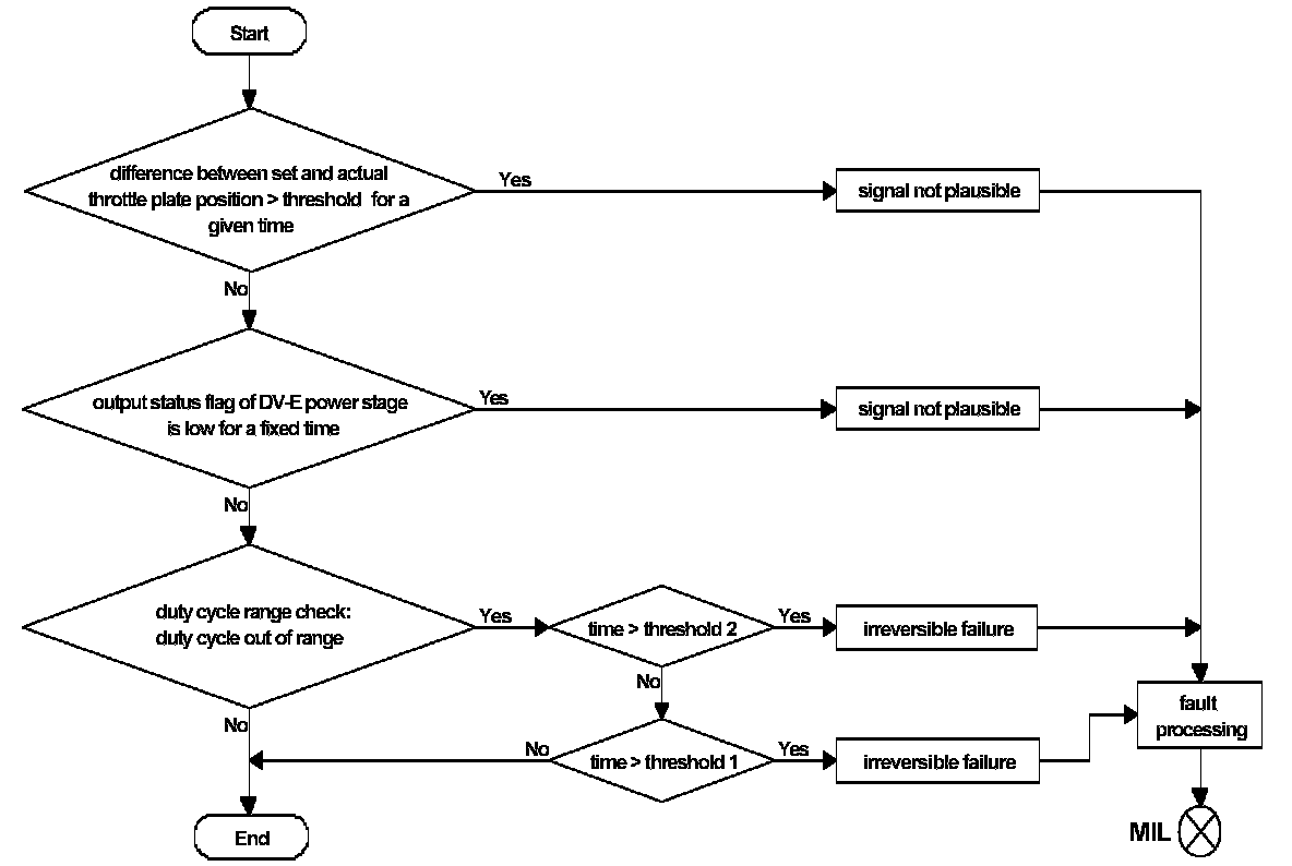 If the DLR output exceeds the upper or lower limit for a time longer than a given time an implausible duty cycle response / implausible actuator current fault is detected. The system is set to throttle valve drive default function state. If DLR output surpasses the limits only for a shorter time the system requests safety fuel deactivation for a short period. This fault is reversible.