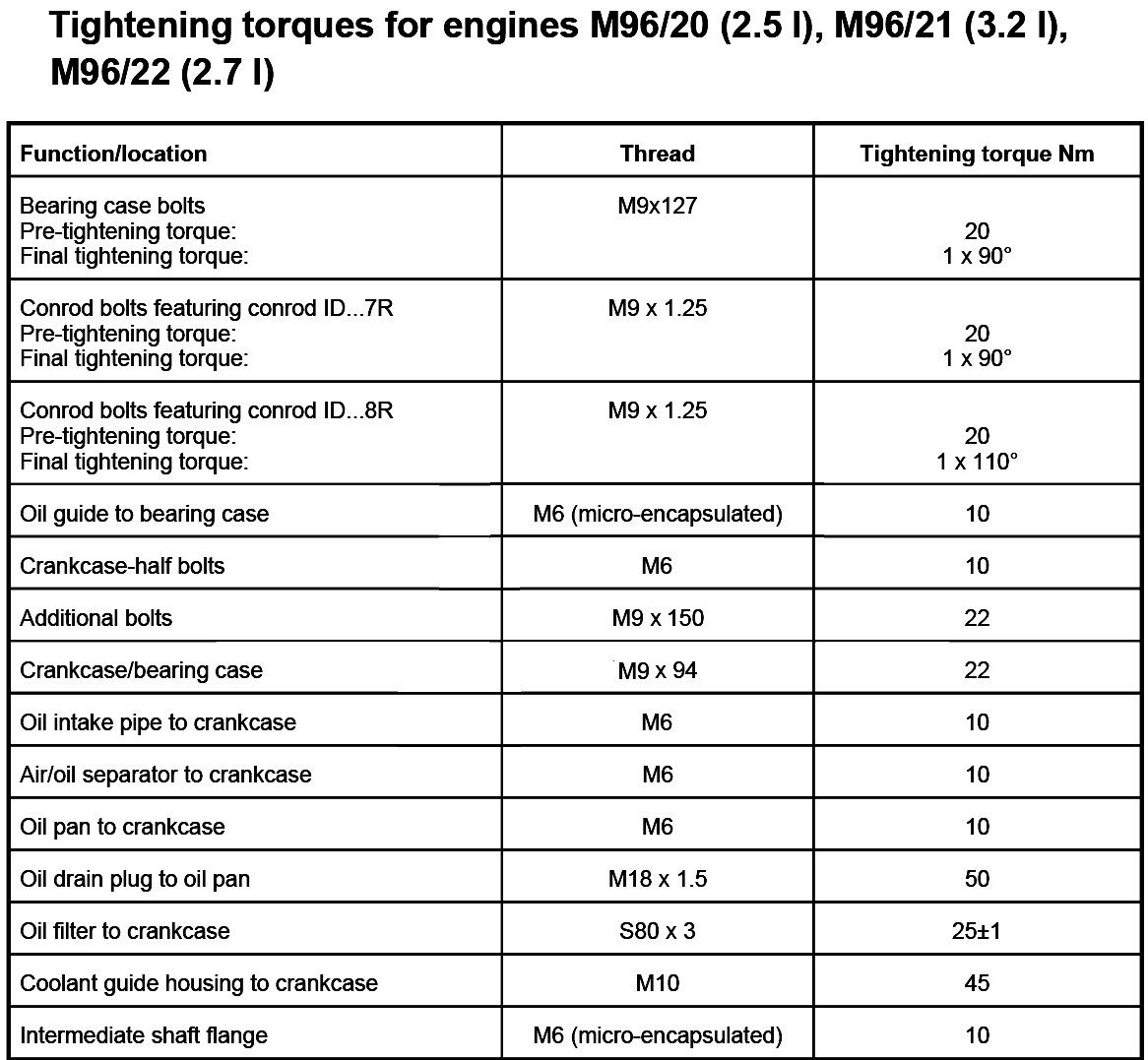 For engine M96/20 (2.5L), M96/21 (3.2L), M96/22 (2.7L)