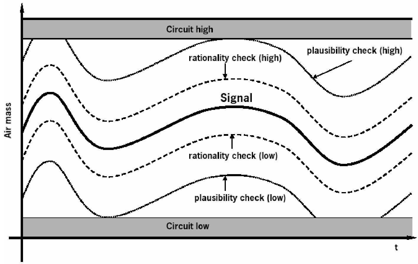The output voltage of the air mass meter is a measure of air mass. The diagnostic routine compares the mass flow measured by the air mass meter with a calculated mass flow, derived from engine speed an throttle position.