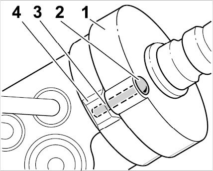 No. 3 is the desired breaking point for bolts in new steering gears. The (new) bolt -2- is inserted into driver -1- and lies with its underside in lug -4- This locks the steering gear in the center position. After installation of a new steering gear, the lower part of the bolt is sheared off (at desired breaking point -3- by turning the steering wheel. The upper part of the bolt -2- remains in the driver.