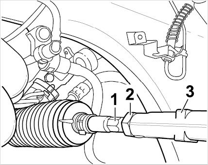 Loosen tie rod lock nut(s) -2- When loosening and tightening the tie rod lock nut(s) counter on the square of the tie rod -3-, with an open ended wrench. Then adjust the toe on the hexagon -1- of the tie rod(s). Then tighten the tie rod lock nut(s) -2- to the prescribed tightening torque.