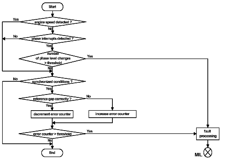 Under normal operating conditions, the flywheel position reference gap is monitored. At a loss of synchronization (more than one tooth difference between expected and observed gap position), the error counter is increased. If the gap is determined correctly the error counter is decreased. As soon as the error counter reaches a certain threshold an engine speed sensor malfunction is detected.