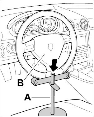 Clamp steering wheel in center position with steering wheel holder -A-. Use only steering wheel holders that do not project into the area of the airbag unit -B- If necessary, shorten the guiding rod of the steering wheel holder at top -Arrow-.