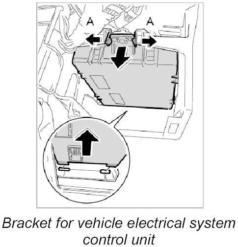 1. Pull apart the locking tabs -A- for the vehicle electrical system control unit, pull the control unit forward and down with connectors still attached, then pull it out of its holder at the rear.