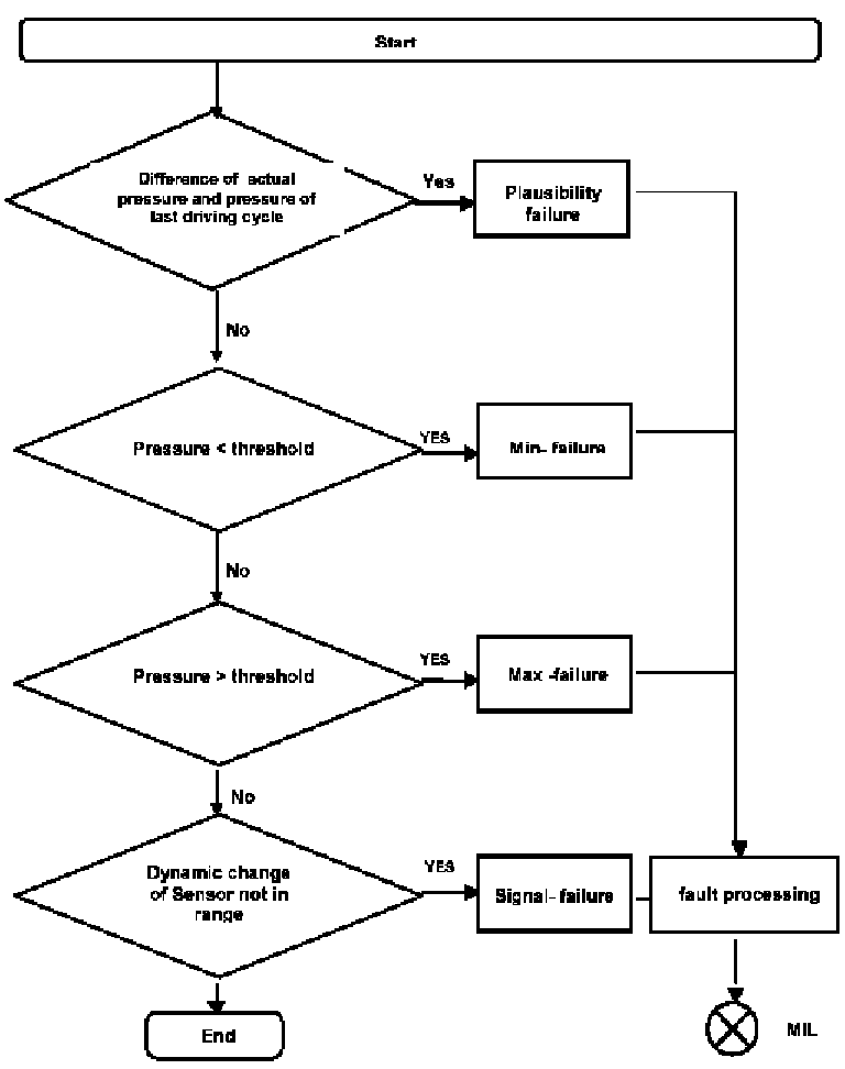 If the difference of the pressure of the last driving cycle and the pressure at the begin of the actual driving cycle exceeds a threshold, a plausibility fault is assumed.
