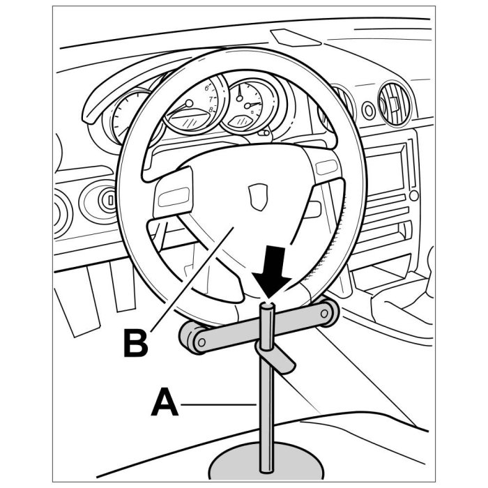2. Clamp the steering wheel in the centre position with the steering wheel holder -A-. Use only steering wheel holders that do not project into the area of the airbag unit -B-. If necessary, shorten the guide rod of the steering-wheel holder at the top -Arrow-.