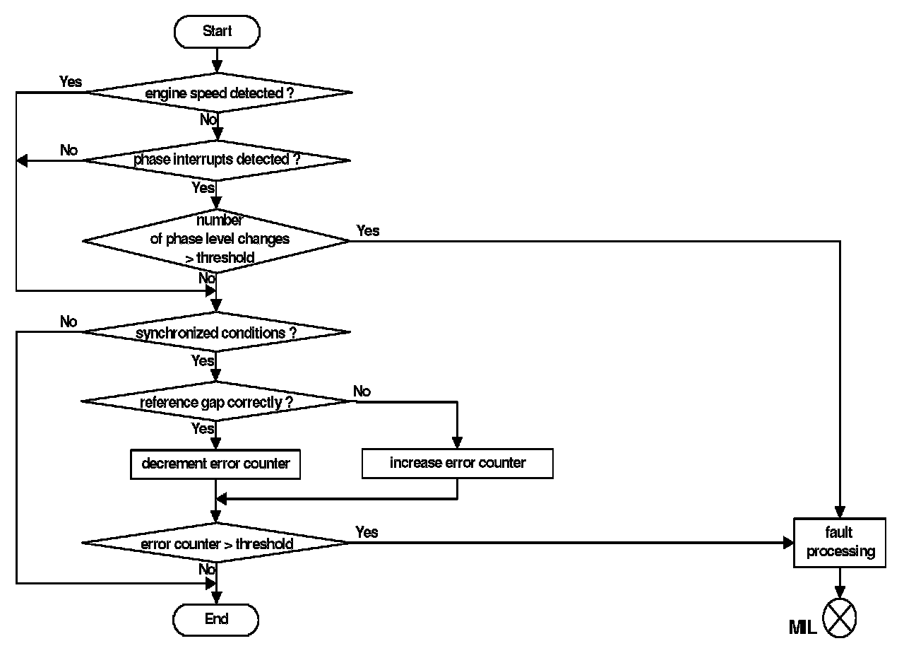 Under normal operating conditions, the flywheel position reference gap is monitored. At a loss of synchronization (more than one tooth difference between expected and observed gap position), the error counter is increased. If the gap is determined correctly the error counter is decreased. As soon as the error counter reaches a certain threshold an engine speed sensor malfunction is detected.