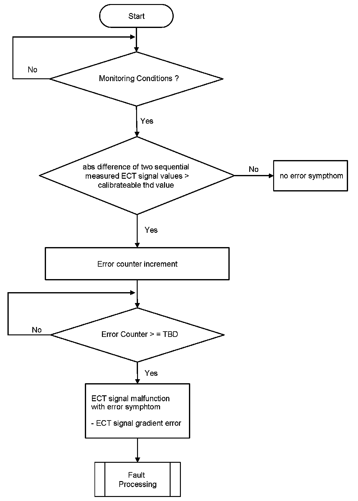 The purpose of this diagnosis is to detect electrical faults of the sensor signal. The input signal is analog from a NTC and has to be in a calibratable range. Short cut to ground can be detected immediately, short cut to voltage battery or open load after a delay time. If an error symptom is detected, the error counter is de-bounced.