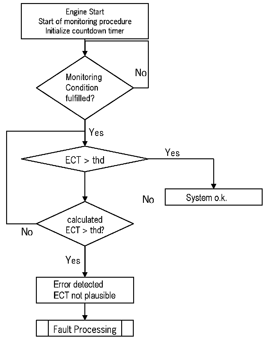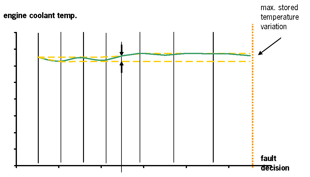 This coolant temperature plausibility diagnosis is performed once per engine run. At low ambient temperature a stuck open thermostat can cause an insufficient engine warm up. In the case that the coolant temperature is lower than the start temperature for coolant thermostat diagnosis a coolant temperature plausibility error will be detected.
