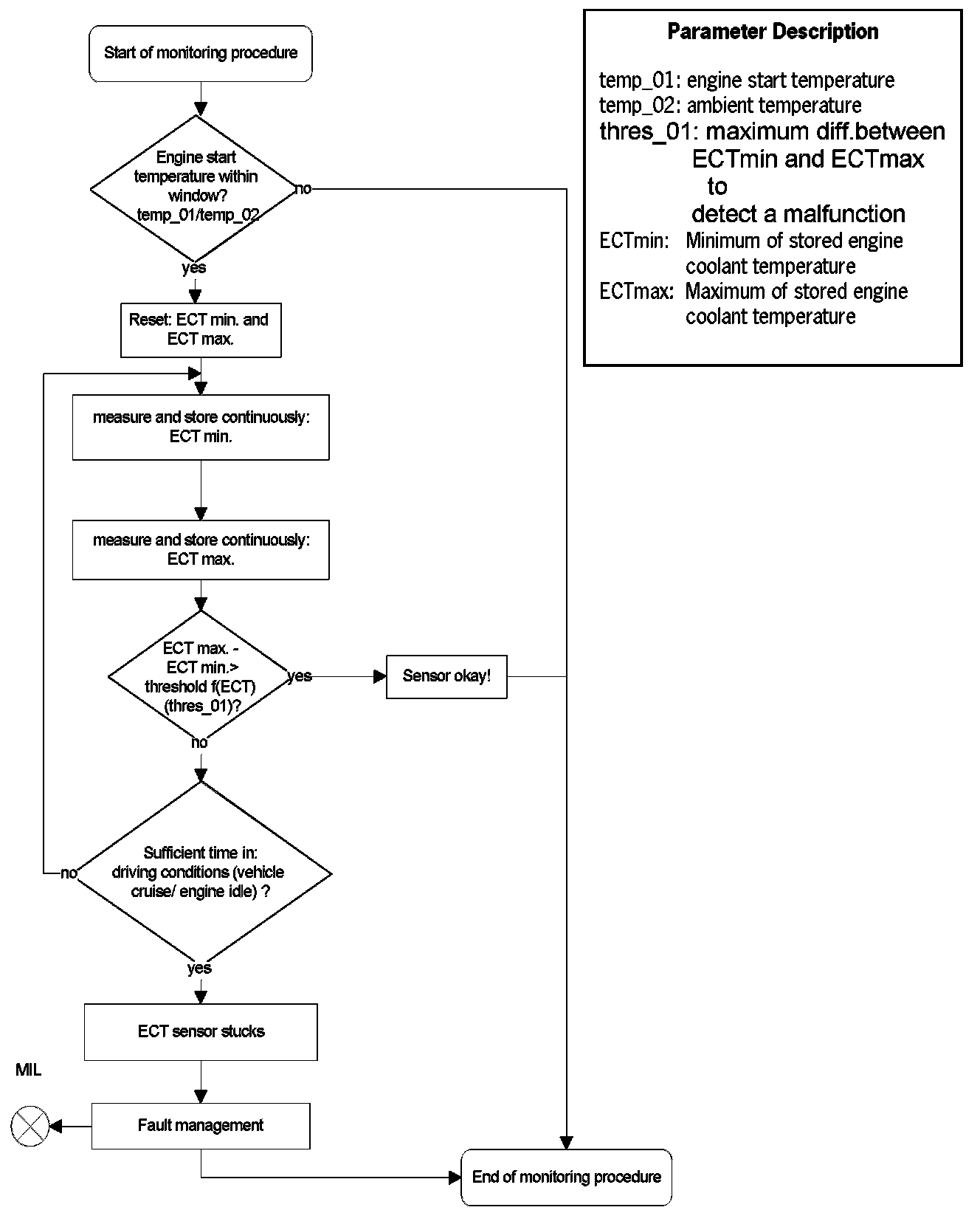 After engine start the system stores continuously the lowest and highest ECT. In case that after several driving conditions the difference between ECT max and ECT min is lower than the threshold the sensor stuck at high values.