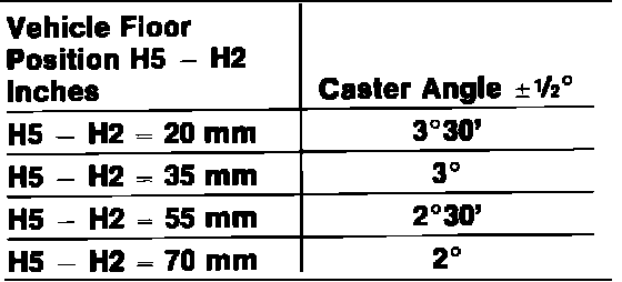 Caster angle on these vehicles is dependent on the angle of the vehicle floor in relation to the ground. To determine correct caster angle, measure front and rear ride height as outlined, calculate and record the difference between measurements and check and adjust caster as follows: