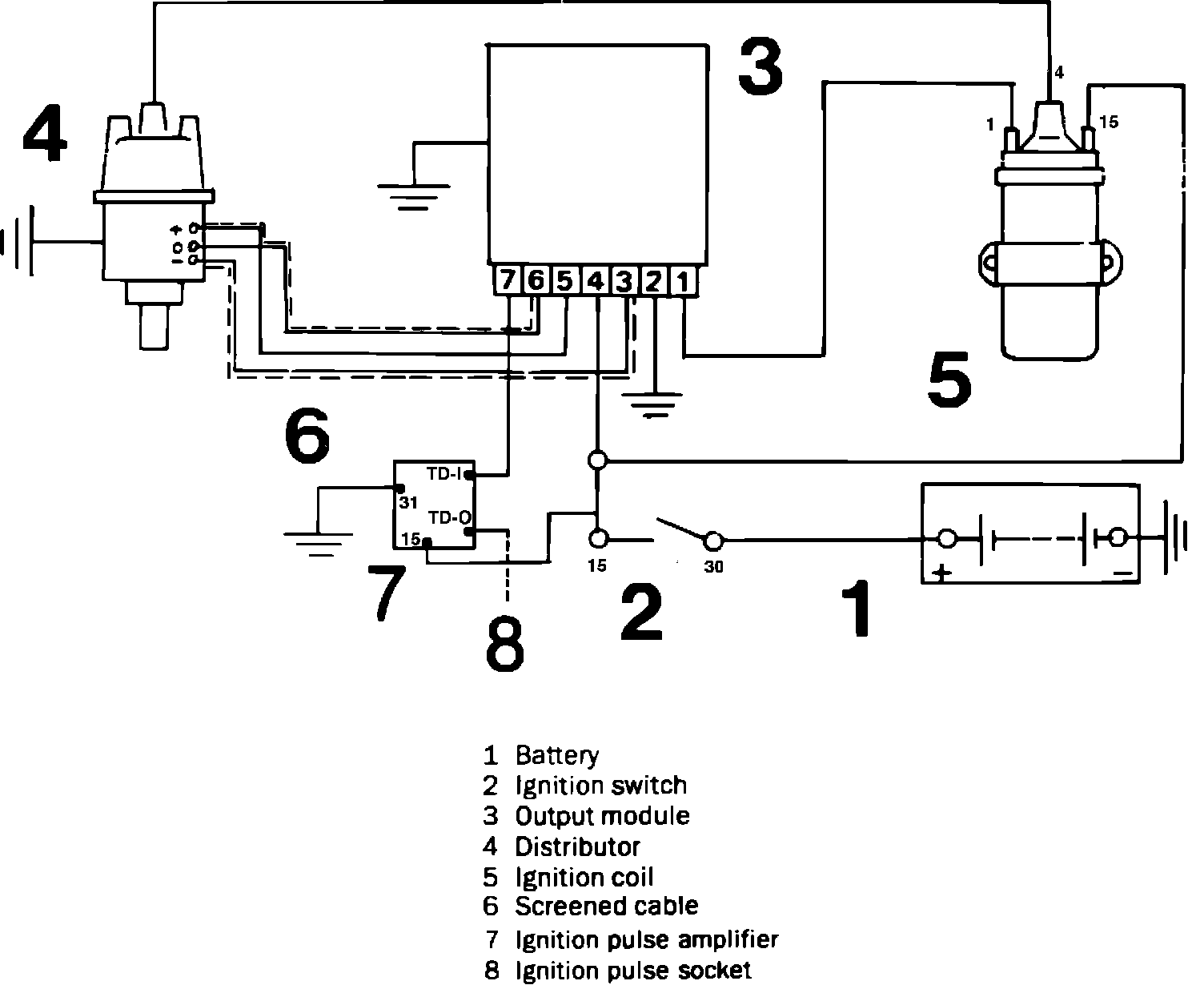 The electronic ignition system, Fig. 4, uses a Hall effect switch to generate a pulse signal. The Hall switch is connected to a control unit that converts and amplifies the Hall signal. The control unit controls the coil.