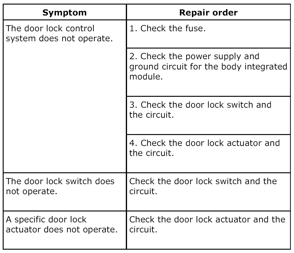 Check the harness for open circuits or shorts between the body integrated module and the door lock switch.