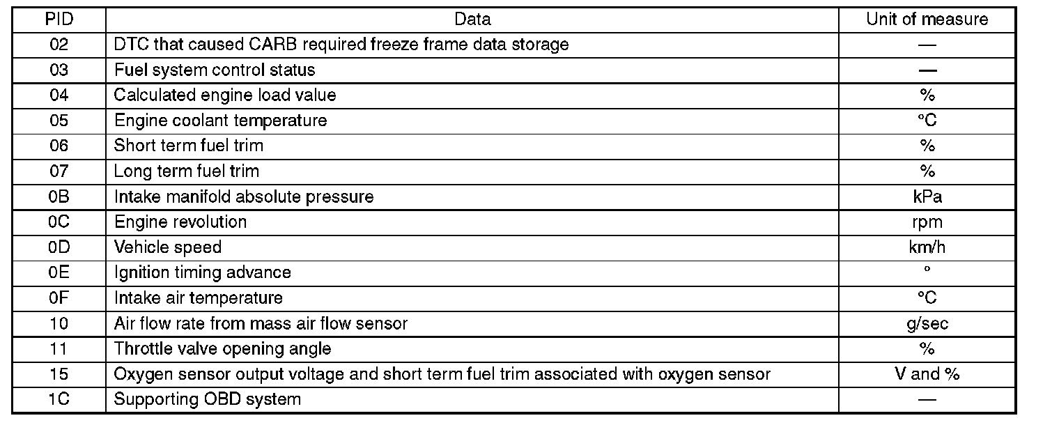 Refers to data denoting the operating condition when trouble is sensed by the on-board diagnosis system. A list of the support data and PID (Parameter Identification) codes are shown in the table.