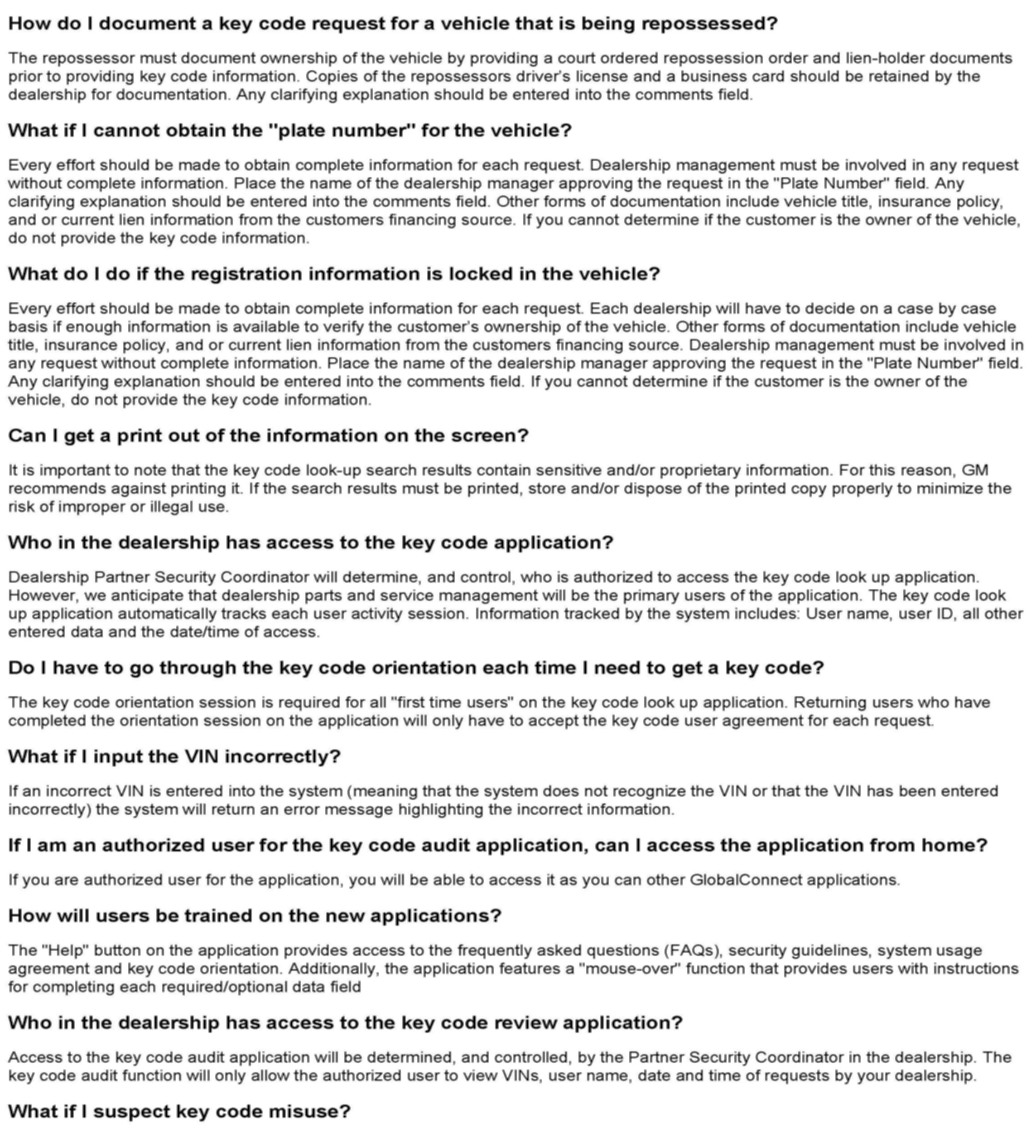 ^ Processes must be in place for dealership management to review the dealership's key code activity regularly through the KeyCode Review function available in GM GlobalConnect.