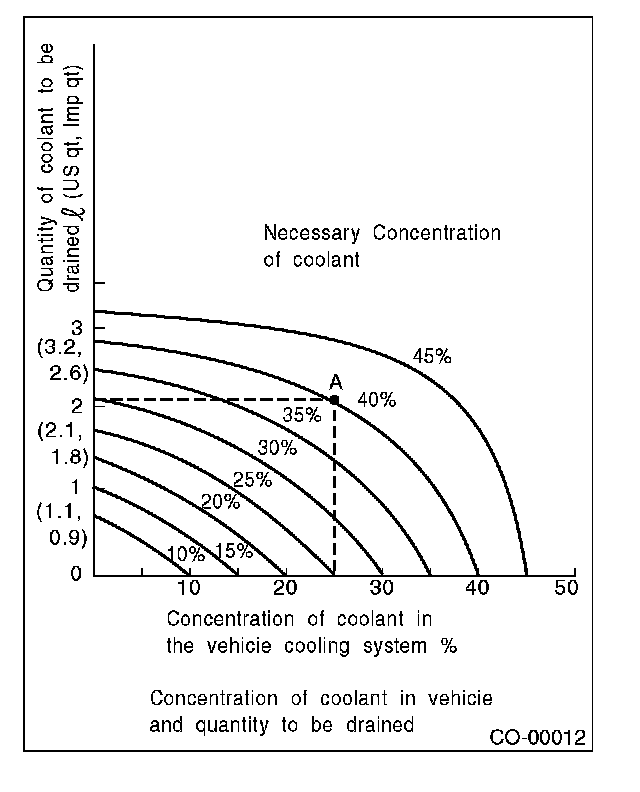 ^ Assume that the coolant concentration must be increased from 25% to 40%. Find point A, where the 25% line of coolant concentration intersects with the 40% curve of the necessary coolant concentration, and read the scale on the vertical axis of the graph at height A. The quantity of coolant to be drained is 2.1 l (2.2 US qt, 1.8 Imp qt). Drain 2.1 l (2.2 US qt, 1.8 Imp qt) of coolant from the cooling system and add 2.1 l (2.2 US qt, 1.8 Imp qt) of the undiluted solution of SUBARU coolant.