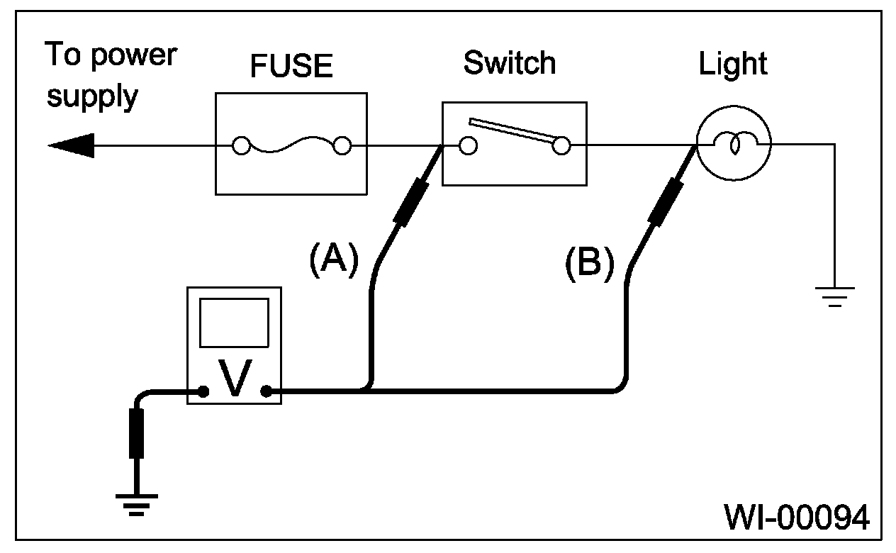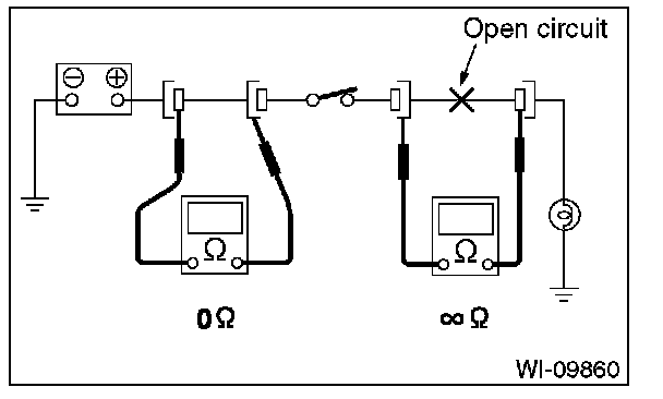Disconnect all connectors affected, and check the continuity in wiring between adjacent connectors. When the ohmmeter indicates "infinite", the wiring is open.