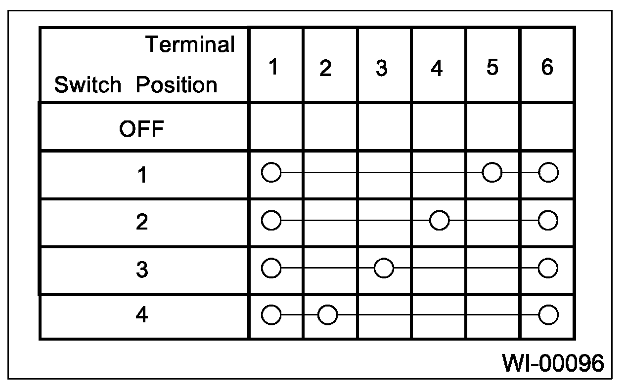 Symbol "o - o" indicates that continuity exists between two points or terminals. For example, when a switch position is at "3", continuity exists among terminals 1, 3 and 6, as shown in table below.