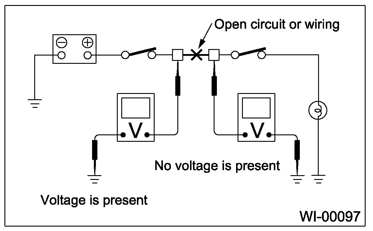 An open circuit is determined by measuring the voltage between respective connectors and ground using a voltmeter, starting with the connector closest to power supply. The power supply must be turned ON so that current flows in the circuit. If voltage is not present between a particular connector and ground, the circuit between that connector and previous connector is open.