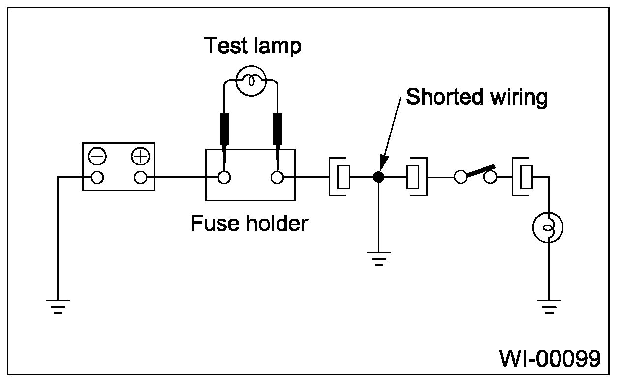 Connect a test light (rated at approx. 3 watts) in place of the blown fuse and allow current to flow through the circuit. Disconnect one connector at a time from the circuit, starting with the one located farthest from power supply. If the test light goes out when a connector is disconnected, the wiring between that connector and next connector (farther from the power supply) is shorted.