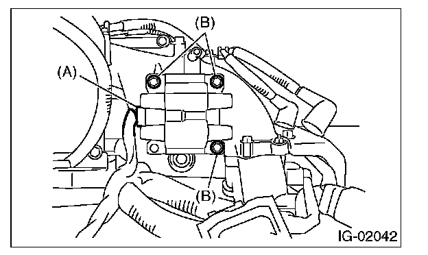 4. Remove the bolt (B) which secures the ignition coil and ignitor assembly to intake manifold.