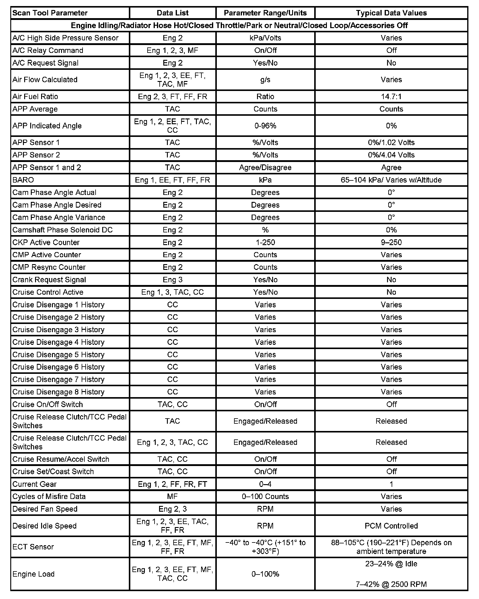 The Engine Scan Tool Data List contains all engine related parameters that are available on the scan tool. The list is arranged in alphabetical order. A given parameter may appear in any one of the data lists, and in some cases may appear more than once, or in more than one data list in order to group certain related parameters together.