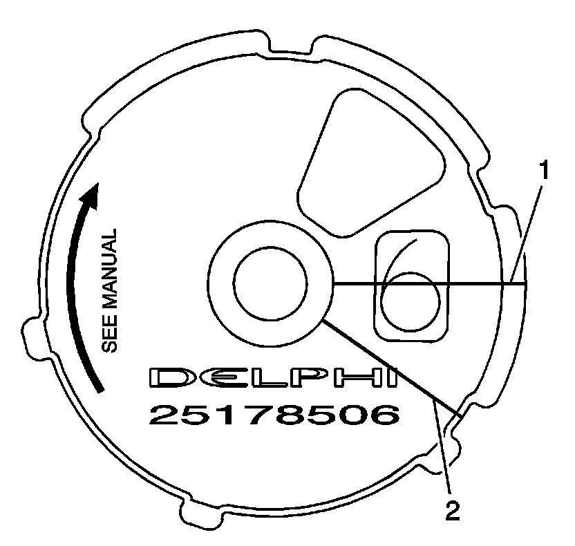 4. Scribe or draw a line (2) on the camshaft position actuator at that position.