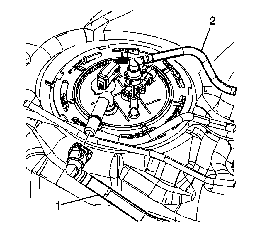 2. Remove the fuel feed (1) and evaporative emission (EVAP) (2) lines from the fuel sender assembly. Refer to Plastic Collar Quick Connect Fitting Service (Plastic Collar Quick Connect Fitting Service).