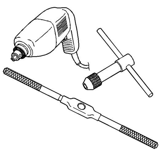 The drill bit and counter bore tool from the tool kit EN 42385-700 kit and EN 42385-2000 insert kit is designed for use with either a suitable tap wrench or drill motor. Limited access and larger hole repair may process better using a tap wrench. An extension from kit EN 43965 extension kit may also be necessary to drive the thread repair tooling dependent on access to the hole being repaired. Use only a tap wrench when tapping the hole and during installation of the insert.