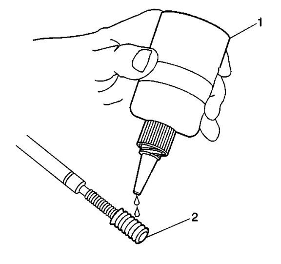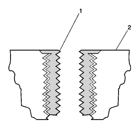 10. Apply threadlock sealant, EN 42385-109, LOCTITE 277(R) or equivalent (1) to the insert OD threads (2). Refer to Adhesives, Fluids, Lubricants, and Sealers for recommended sealant.