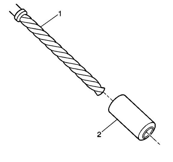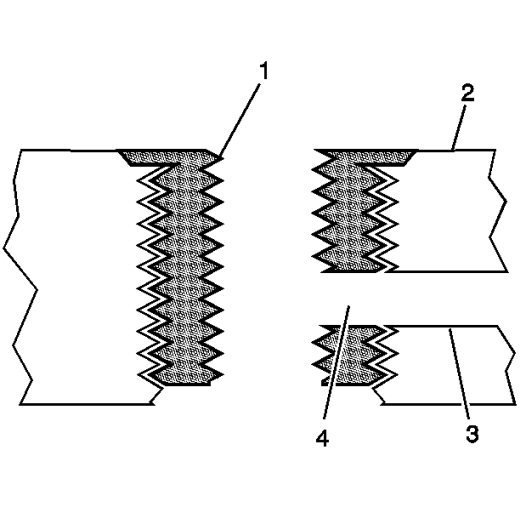 6. Apply threadlock sealant, EN 42385-109, LOCTITE 277(R) or equivalent (1) to the insert OD threads (2). Refer to Adhesives, Fluids, Lubricants, and Sealers for recommended sealant.