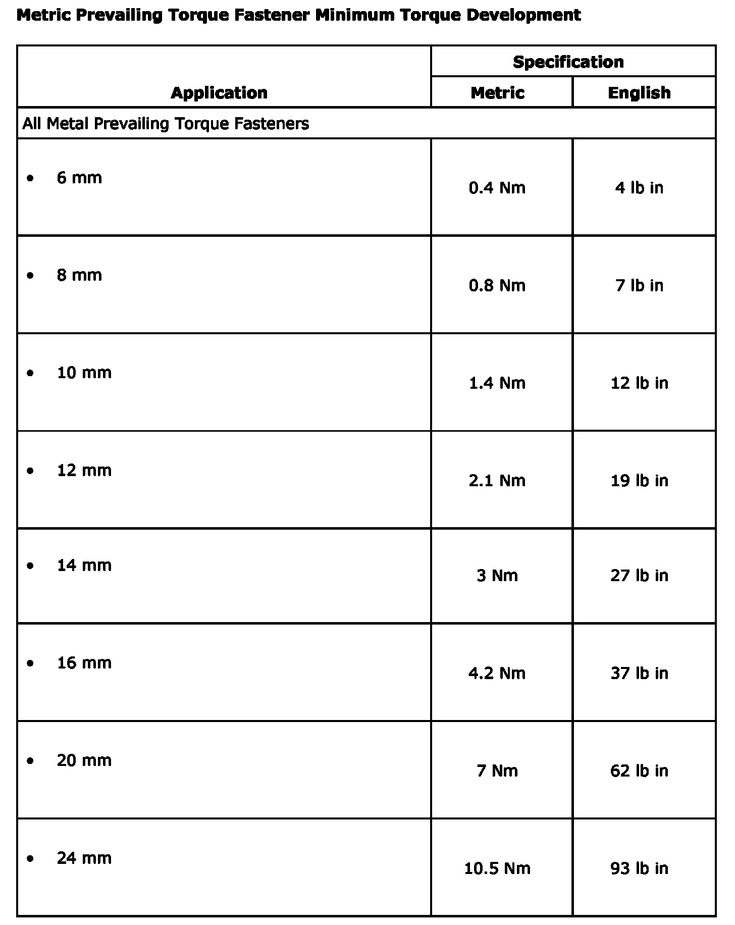 Metric Prevailing Torque Fastener Minimum Torque Development